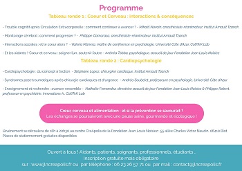 Nous vous donnons rendez-vous pour une table ronde interdisciplinaire dédiée aux liens étroits entre le cœur et le cerveau : conséquences après circulation extracorporelle, monitorage cérébral, cardiopsychologie, rôle des aidants… et un focus prévention autour de l’alimentation.